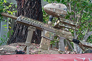 Most notable on the marker is the Classic Army M203 style grenade launcher under the barrel. Mounted to the R.I.S. and able to be removed in seconds, the M203 fires Nerf Vortex rockets using a Mad Bull .68 Cal paintball shell for an air source (no paintballs are loaded in the shell). With these shells modified for high pressure operation, the M203 has a range of about 150 yards. It can be used just like a normal LAW rocket and can take out tanks and bunkers. The marker also has a Laseraim Illusion red dot mounted to a carry handle sight rail that allows the shooter to take advantage of the longer range afforded by the Hop Up barrel. With a good paint to barrel match, the MT66 can hit targets on the first shot over 90 feet away. Used with the Palmer's inline Stabilizer equipped remote line the MT66 is very consistant adding to its overall accuracy.